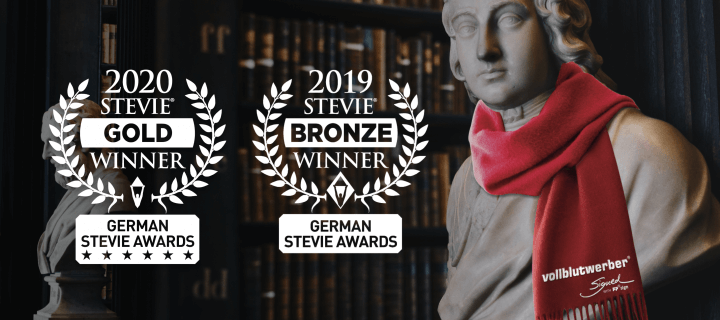 Doppel-GOLD und BRONZE für VOLLBLUTWERBER bei den German Stevie® Awards 2020 und 2019 in der Kategorie »Marketing-Kampagne des Jahres«. Wir sind mega stolz!